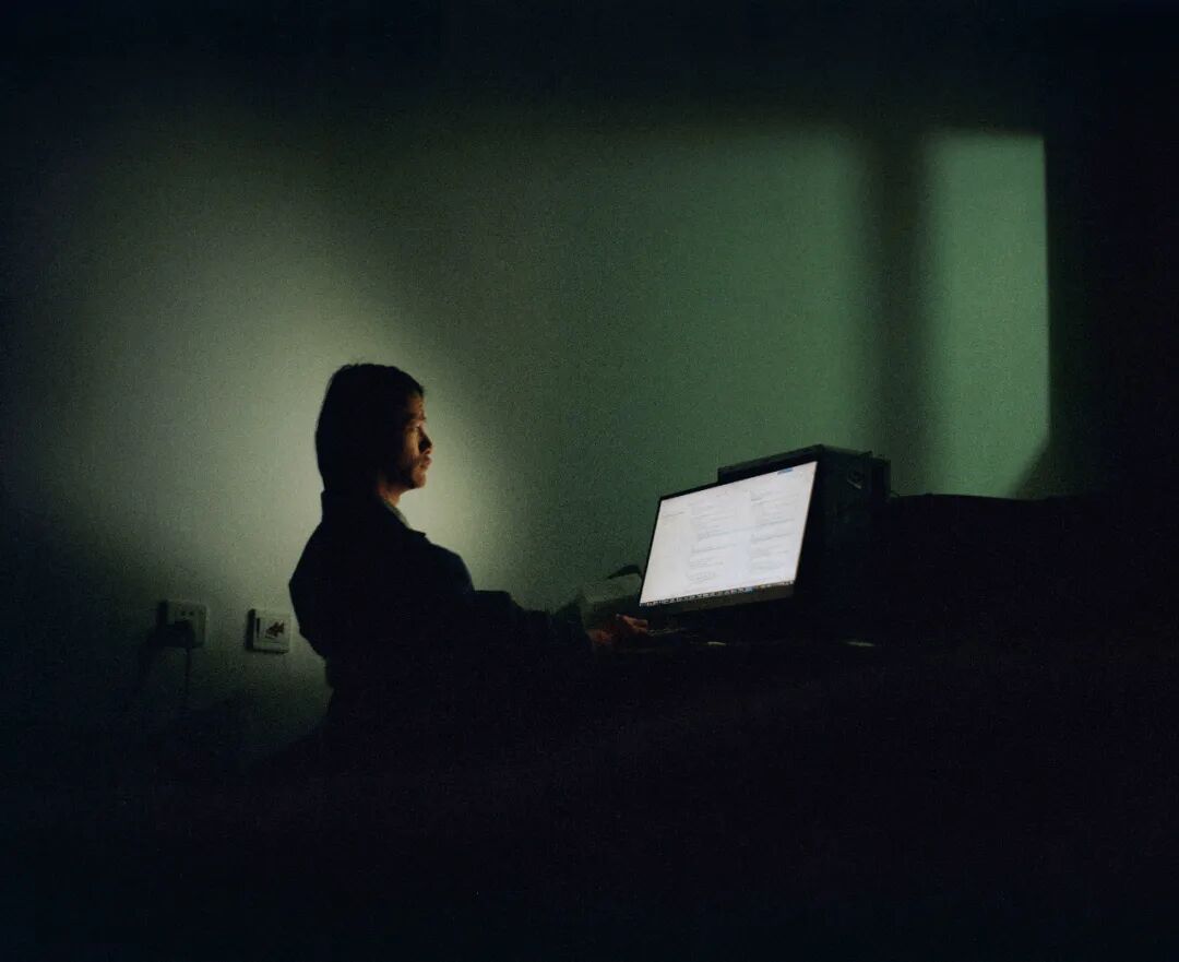 我和他约在了公寓见面,他在深夜里工作,面对着电脑。但我把相机架好,构好图,却迟迟没法拍摄,我不知道为什么。阿辉看到我的困境之后,立马把窗帘拉开,走廊微弱的灯光,就透过绿色的窗户打到了他的墙壁上,那一刻,我毫不犹豫地按下了快门。