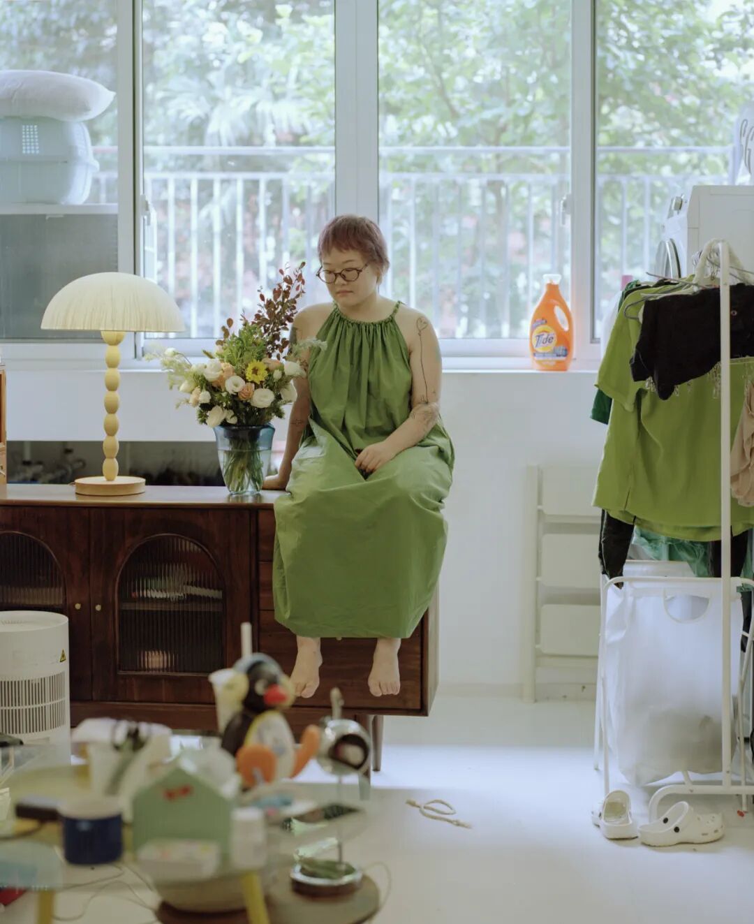 一名模特,站在杭州家中的阳台