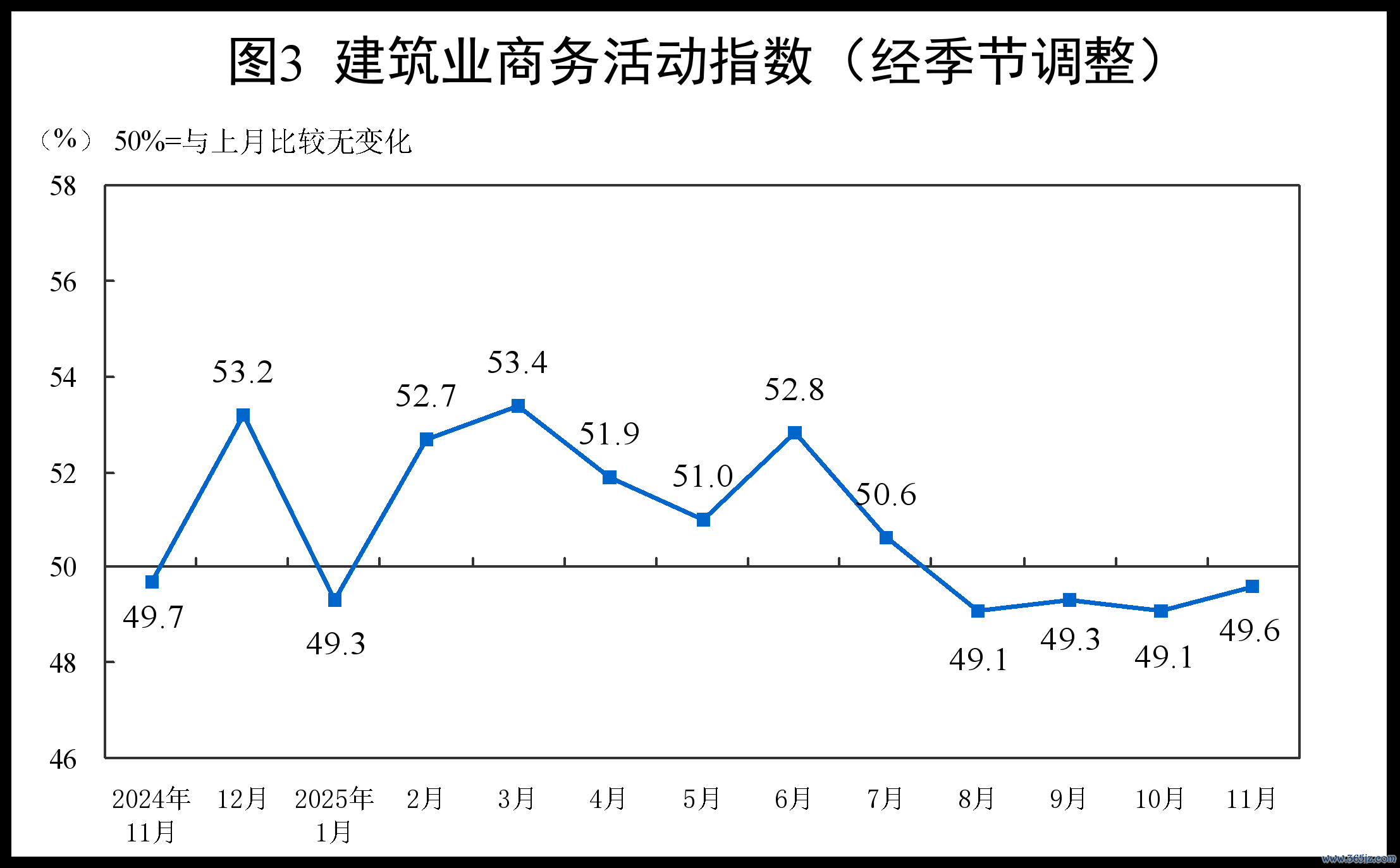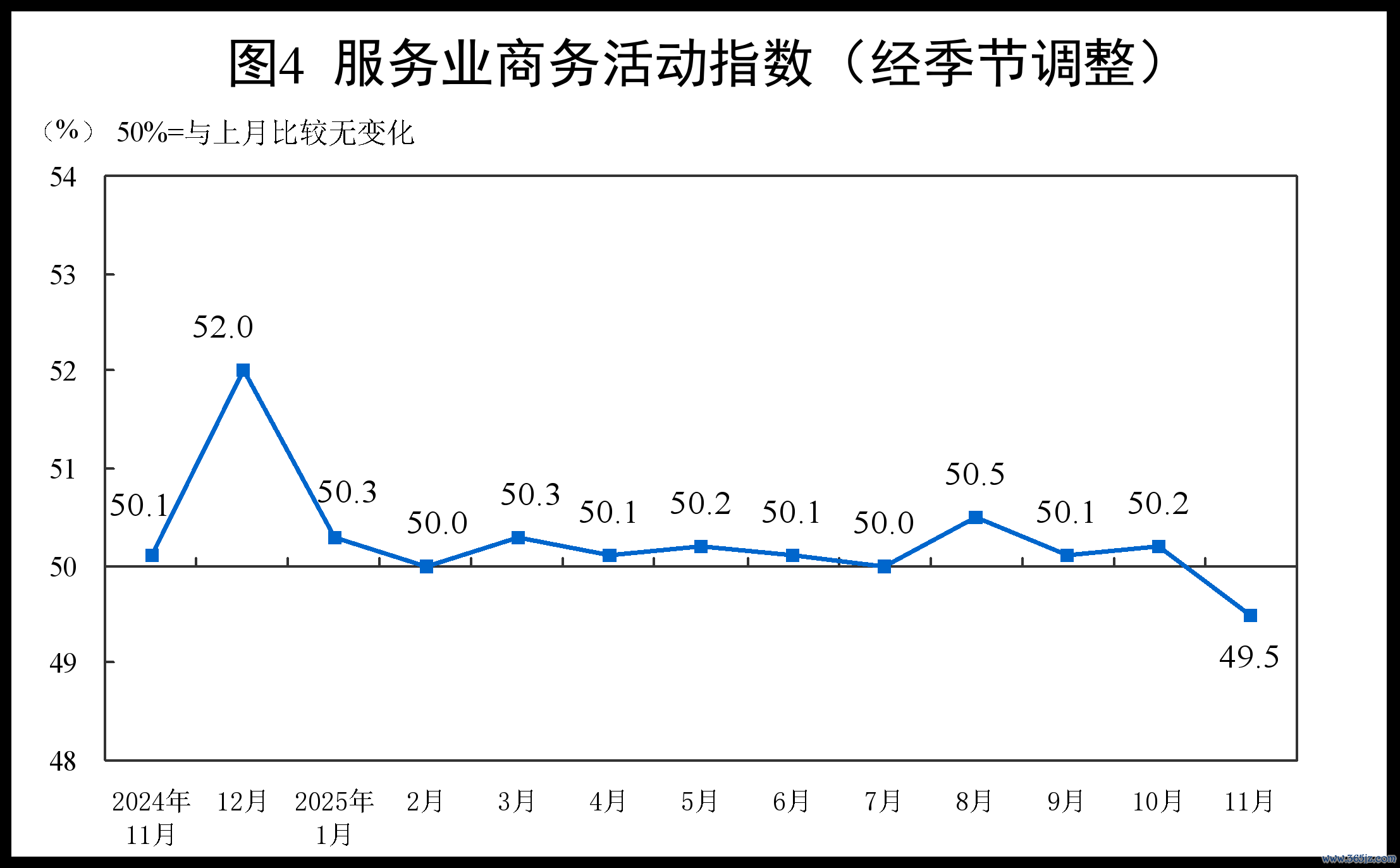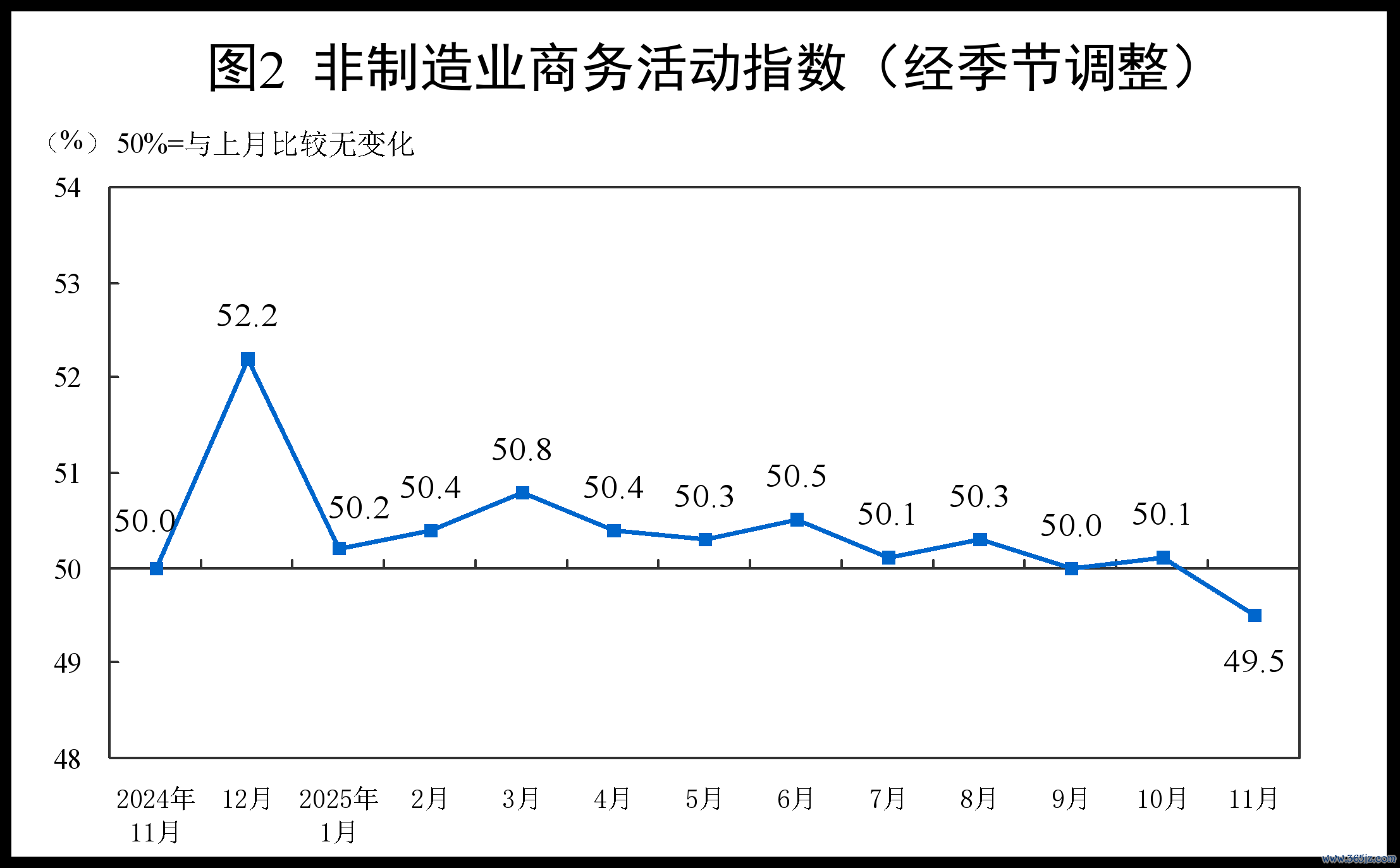 11月份,非制造业商务活动指数为49.5%,比上月下降0.6个百分点。
