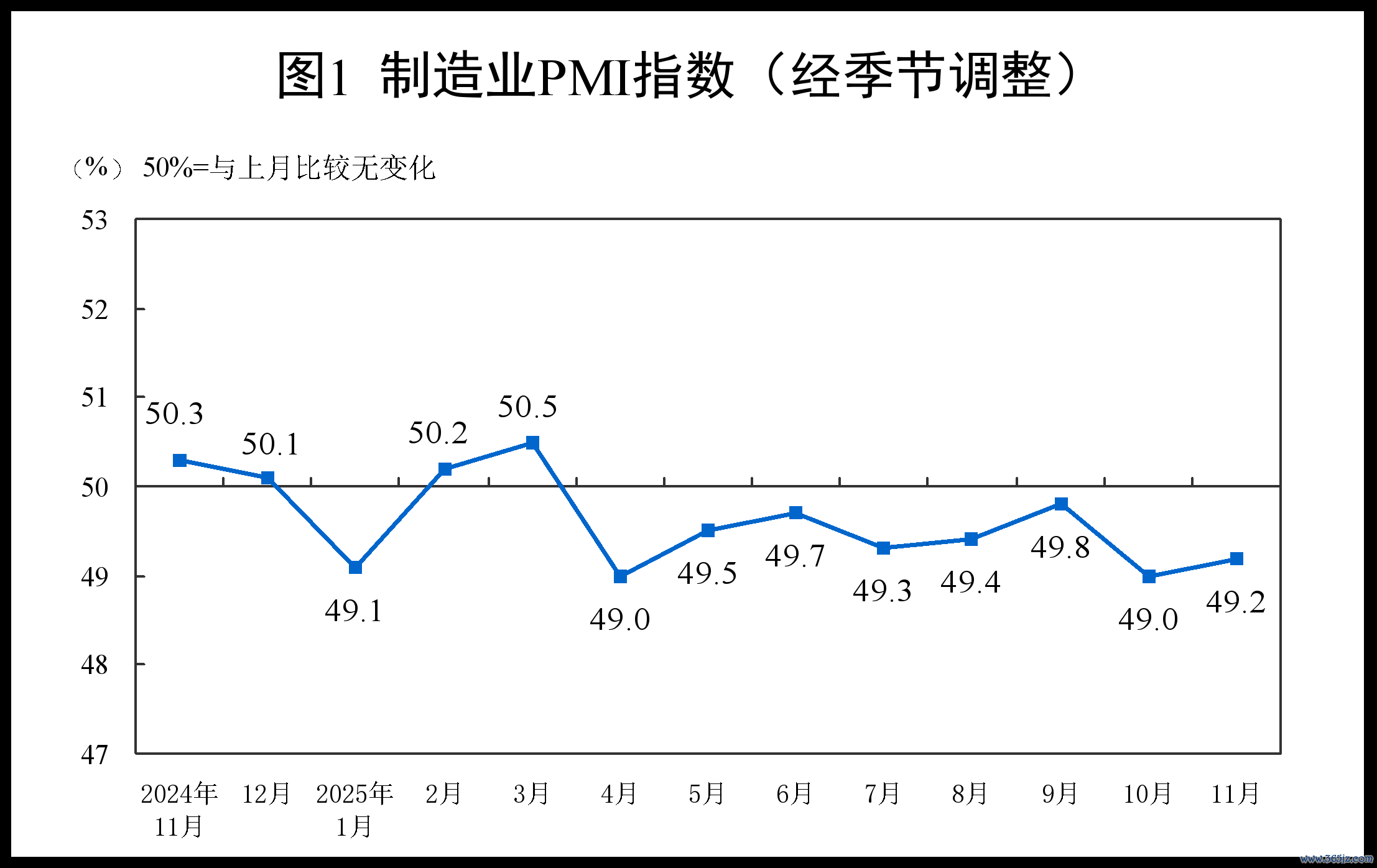 11月份,制造业采购经理指数为49.2%,比上月上升0.2个百分点;非制造业商务活动指数为49.5%,比上月下降0.6个百分点;综合PMI产出指数为49.7%,比上月下降0.3个百分点,我国经济景气水平总体平稳。