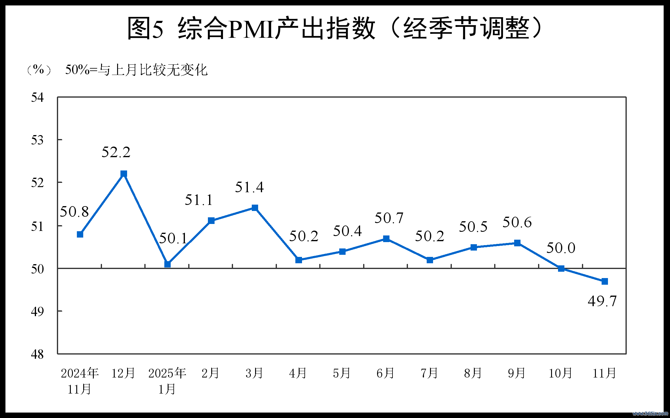 11月份,综合PMI产出指数为49.7%,比上月下降0.3个百分点,构成综合PMI产出指数的制造业生产指数和非制造业商务活动指数分别为50.0%和49.5%。